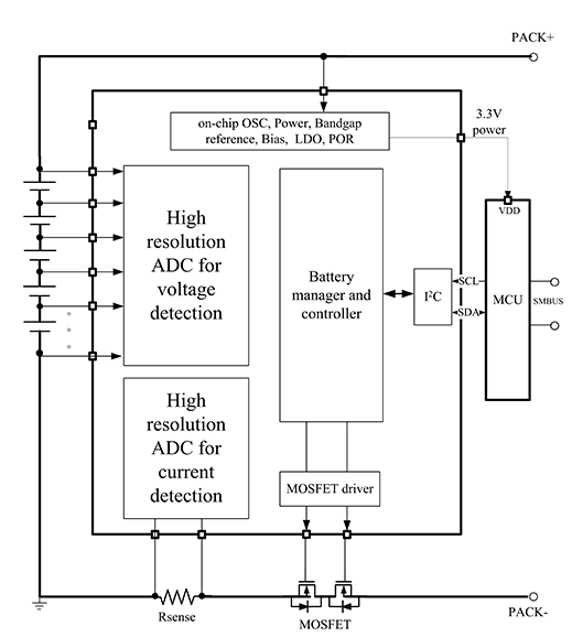 鋰電池組保護(hù)芯片HSM12X0系列包括HSM1220、HSM1230和HSM1240。該系列芯片內(nèi)部集成了高精度ADC可以對(duì)電池組的電壓、電流以及溫度信號(hào)進(jìn)行采集并通過I2C接口將數(shù)據(jù)傳遞給主機(jī)微控制器。該芯片還具有簡單的過壓保護(hù)、欠壓保護(hù)、過流保護(hù)以及短路保護(hù),支持被動(dòng)均衡。