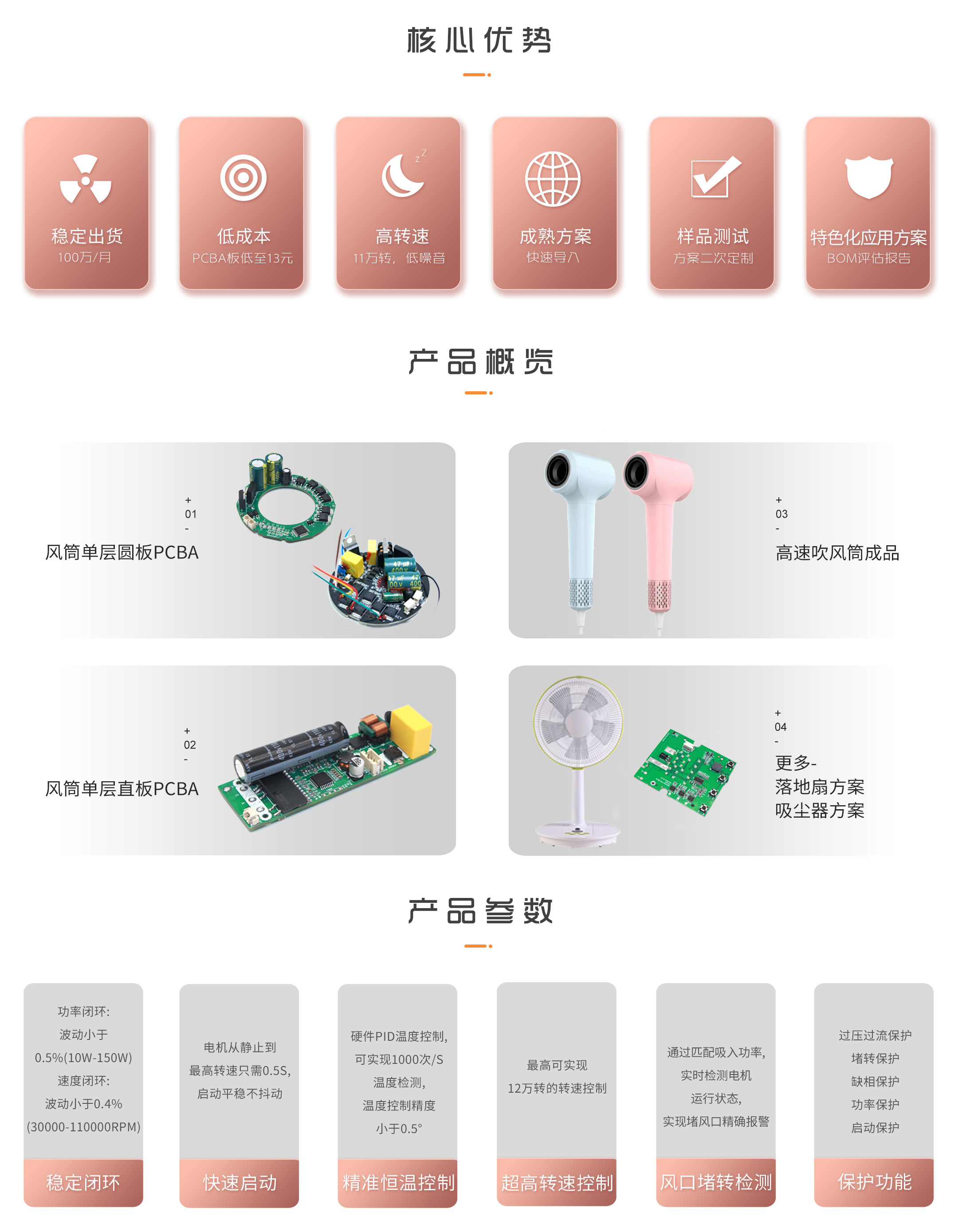 ●啟動迅速、噪聲低、可快速插拔操作 ●支持正弦波FOC無刷電機控制 ●支持多檔風力和多檔溫度控制 ●可過3C、EMC、UL或CE等產品認證 ●提供風道設計和結構設計,快速穩(wěn)定加速項目落地 ●批量穩(wěn)定出貨100萬+ |