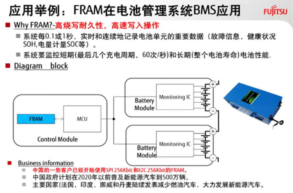 FRAM高耐久(可擦寫10萬(wàn)億次)的特性,剛好滿足BMS等關(guān)鍵型應(yīng)用對(duì)存儲(chǔ)器的優(yōu)異性能與穩(wěn)定可靠的需求。