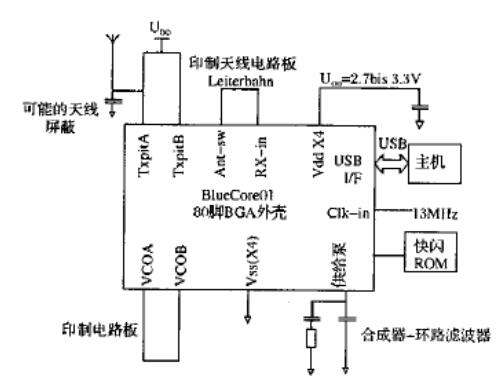 圖2單芯片藍(lán)牙方案“Bluecorco1”,只需少量外接元件,尤其是沒有電感、微調(diào)電容器、共振器或濾波器