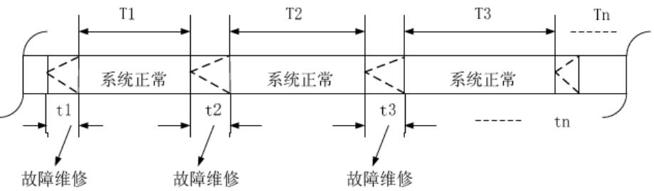 (1)可靠性,指某一時(shí)間段內(nèi)設(shè)備或系統(tǒng)連續(xù)運(yùn)行而無故障發(fā)生的概率。重要表征參數(shù)是平均無故障時(shí)間(Mean Time Between Failure,簡稱MTBF)是指相鄰兩次故障之間的平均工作時(shí)間,也稱平均故障間隔時(shí)間。如圖1所示MTBF= ,系統(tǒng)故障率λ= 1/MTBF。