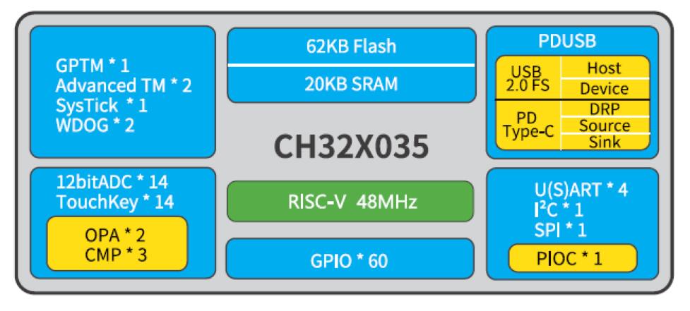 CH32X035系列是基于青稞V4C內(nèi)核設(shè)計的工業(yè)級微控制器。內(nèi)置USB和PD PHY,支持USB Host主機和USBDevice設(shè)備功能、PDUSB及Type-C快充功能,內(nèi)置可編程協(xié)議I/O控制器,提供OPA運放、CMP電壓比較器、USART串口、/2C、SPI、定時器、12位ADC、Touchkey等豐富外設(shè)資源。