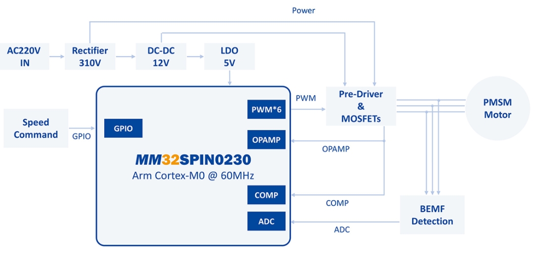 MM32SPIN0230,它采用Arm® Cortex-M0內(nèi)核,最高工作頻率可達(dá)60MHz,內(nèi)置32KB Flash和4KB SRAM,具備1路12位模數(shù)轉(zhuǎn)換器ADC,支持11通道,采樣速率達(dá)1Msps,以及4個(gè)通用定時(shí)器和1個(gè)專為電機(jī)控制設(shè)計(jì)的PWM高級(jí)定時(shí)器。此外,它還支持UART/SPI通信,并內(nèi)置2個(gè)運(yùn)放、2個(gè)比較器,專為電機(jī)應(yīng)用而設(shè)計(jì)。