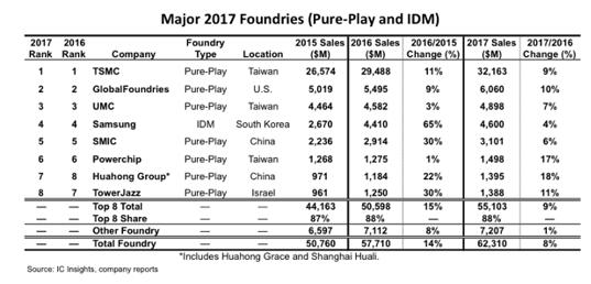 排在首位的臺(tái)積電2017年實(shí)現(xiàn)銷售額321.63億美元,同比增長9%,以261億美元的差距超越第二位的美國廠商環(huán)球晶圓。在前八名企業(yè)中,三星是唯一一家IDM廠商(整合元件制造商),2017年晶圓制造業(yè)務(wù)銷售額為46億美元,排名第四。