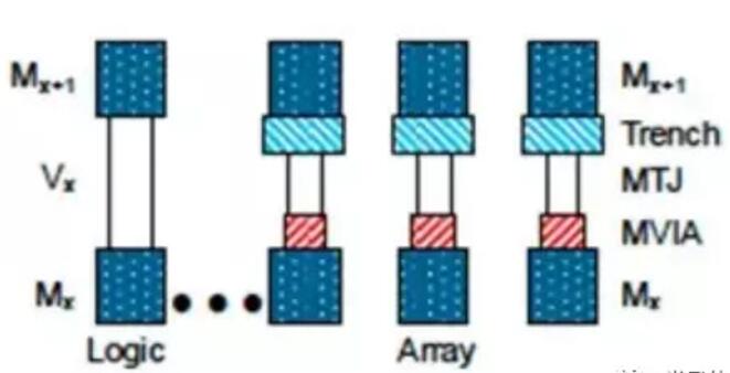 圖2顯示了1 Gb陣列中的pMTJ位以及芯片的BEOL金屬化中的相鄰邏輯區(qū)域的集成。