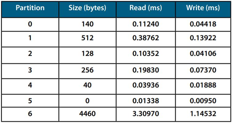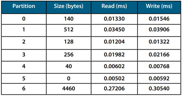 MRAM低級驅動程序通過操作系統(tǒng)和調度程序集成到動力總成應用程序中。讀寫周期由系統(tǒng)時鐘(300MHz)測量。圖1&2顯示了針對動力總成應用的具有不同非易失性存儲器接口的每個分區(qū)的讀/寫時間。這些表顯示大多數(shù)讀/寫周期小于2ms。毫不奇怪,該表確認35ns并行接口以比40MHz
