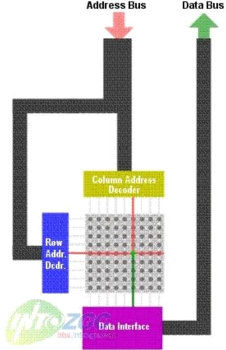 需要注意的是RAM內(nèi)的部存儲(chǔ)信息的矩陣并不是一個(gè)正方形的,也就是行和列的數(shù)目不是相同的--行的數(shù)目比列的數(shù)目少(DRAM)。