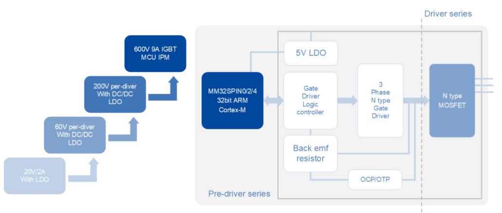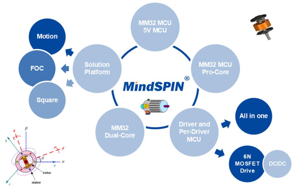 SPIN是旋轉(zhuǎn)的同義詞,再注入靈動(dòng)微電子的靈魂Mind,表示靈活與專業(yè)。包含了三大主軸:專業(yè)MCU,專用驅(qū)動(dòng)MCU微控制器及解決方案平臺(tái)。專用MCU的獨(dú)特之處是帶領(lǐng)了許多主流應(yīng)用,如:電動(dòng)車的應(yīng)用,目前市場(chǎng)的占有率仍然保持領(lǐng)先地位;專用驅(qū)動(dòng)型MCU微控制器電壓范圍從20V至600V。例:MM32SPIN222C集成了三相MOSFET、預(yù)驅(qū)以及LDO,可讓小空間發(fā)揮最大的功能,同時(shí)內(nèi)建了高性能32位的Arm Cortex-M0內(nèi)核為運(yùn)算核心,讓開(kāi)發(fā)更為簡(jiǎn)單快捷;解決方案平臺(tái)由擁有超過(guò)10年以上算法開(kāi)發(fā)經(jīng)驗(yàn)的MindSPIN團(tuán)隊(duì)精心打造,按技術(shù)方式分為方波、旋波FOC以及位置控制三類,按應(yīng)用方式可分為風(fēng)機(jī)、電動(dòng)工具、微電機(jī)、家電以及電動(dòng)車五大類,同時(shí)靈動(dòng)微電子還提供了不同的相對(duì)應(yīng)的特色