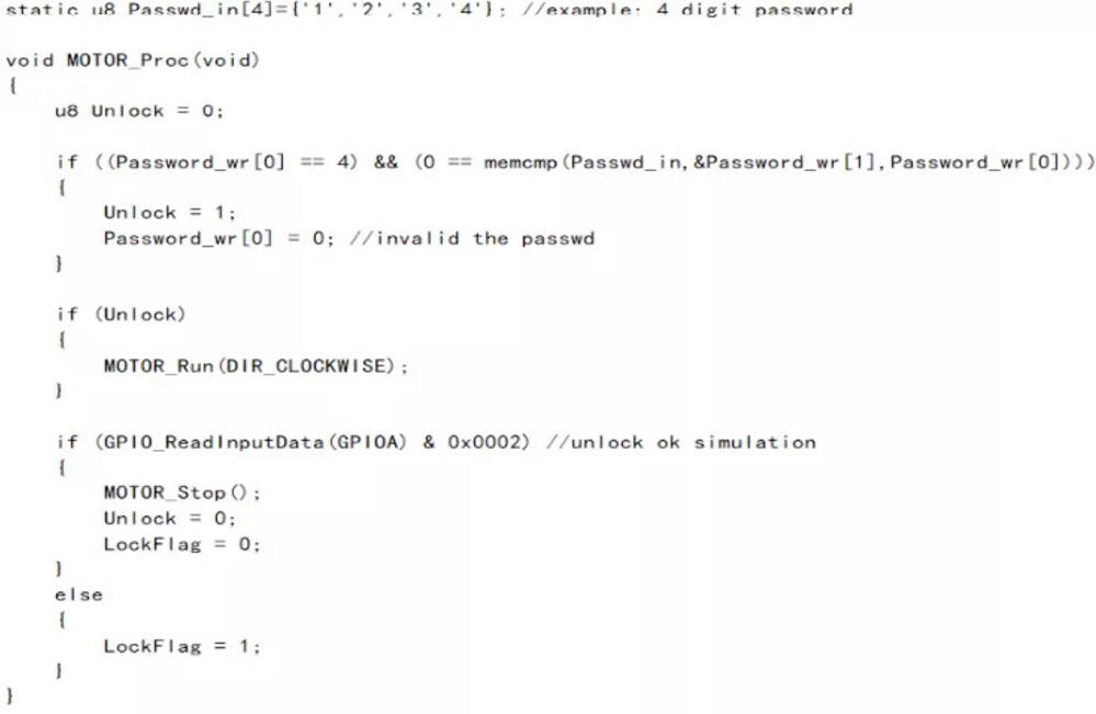 在MOTOR_Proc()處理函數(shù)中針對藍(lán)牙接收到的密碼數(shù)據(jù)進(jìn)行解析,如果與默認(rèn)設(shè)置的4位0-9數(shù)字密碼完全匹配上則操作解鎖,將DC馬達(dá)按照設(shè)定方向控制運(yùn)轉(zhuǎn),為了簡易驗證,模擬一個信號表示解鎖成功,這里是通過采集指定IO引腳PA1的輸入來實(shí)現(xiàn),采集到輸入為高電平那么停止DC馬達(dá)轉(zhuǎn)動,且清零鎖定標(biāo)志位。以下為代碼實(shí)現(xiàn)內(nèi)容: