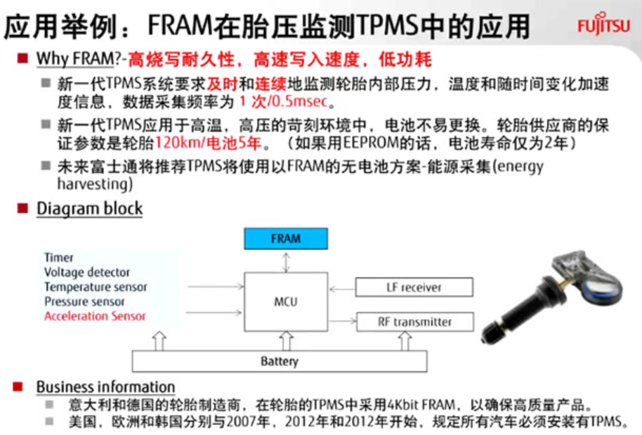 FRAM低功耗的特點(diǎn)能發(fā)揮優(yōu)勢(shì);另一方面,為了確保足夠的安全性,胎壓數(shù)據(jù)必須頻繁地寫入與記錄,按一秒鐘寫入一次計(jì)算,使用10年則累計(jì)寫入3.2億次。而FRAM的高讀寫耐久性使之支持寫入次數(shù)達(dá)10萬(wàn)億次,性能遠(yuǎn)高于價(jià)格親民的EEPROM,成為安全控制系統(tǒng)的非易失性存儲(chǔ)器首選。