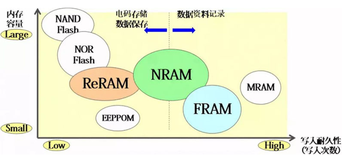 MRAM和ReRAM)都更貼近通用性存儲(chǔ)器。他們一般用于更換閃存芯片,因而NRAM在理論上既能夠更換DRAM,還可以更換閃存芯片。