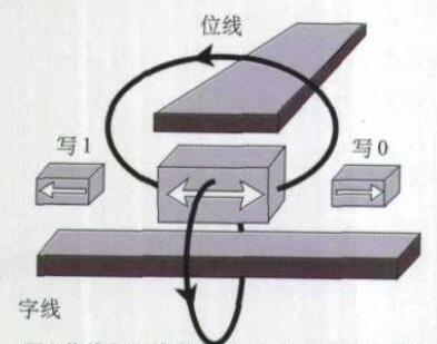 MRAM單元自由層產(chǎn)生的合成磁場來實現(xiàn)。在運行時,利用編碼排序使二維MRAM陣列中只有一條字線和一條位線通過電流(如圖1),因而只有一個MRAM單元被選中,這時可以有兩種寫人狀態(tài):
