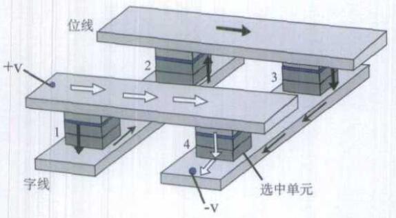 圖4給出由4個MRAM單元組成的刪格,在一條位線和一條字線加上電壓后,由圖可見被選中的是4號MRAM單元,這時電流從‘+V’電極流至‘-V’電極可以有兩條通道。