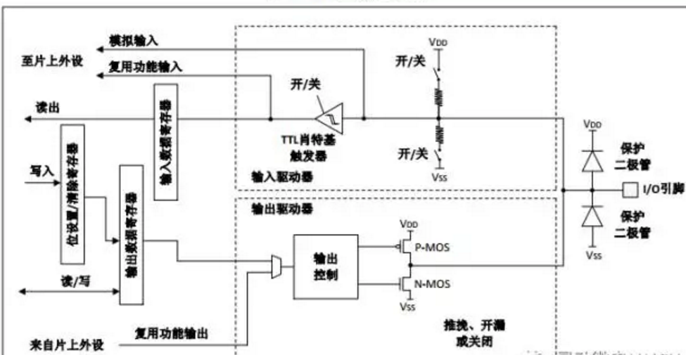 模擬輸入是指模擬信號(hào)的輸入。配置模擬輸入時(shí),所有的上拉、下拉電阻和施密特觸發(fā)器,均處于禁止?fàn)顟B(tài),因此“輸入數(shù)據(jù)寄存器”將不能反映端口上的電平狀態(tài),也就是說(shuō)模擬輸入配置下,CPU不能在“輸入數(shù)據(jù)寄存器”上讀到有效的數(shù)據(jù)。