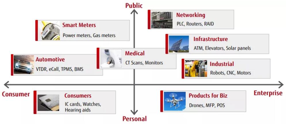 經(jīng)過市場的長期廣泛驗證以及技術(shù)的不斷突破,富士通FRAM產(chǎn)品已成功應用于智能卡及IC卡等卡片領(lǐng)域、電力儀表及產(chǎn)業(yè)設備等工業(yè)領(lǐng)域,醫(yī)療設備及醫(yī)療RFID標簽等醫(yī)療領(lǐng)域、胎壓監(jiān)測及新能源汽車電池管理系統(tǒng)等汽車領(lǐng)域等等,涉及的應用超過200種,幾乎覆蓋所有主要領(lǐng)域!