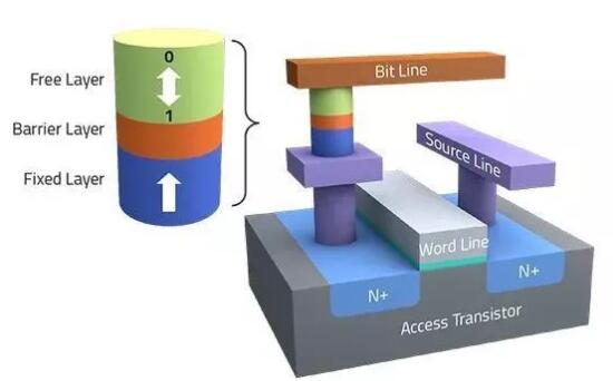 STT-MRAM是具有磁隧道結(jié)(MTJ)存儲(chǔ)器單元的單晶體管架構(gòu)。它利用電子自旋的磁性在芯片中提供非揮發(fā)性特性。寫入和讀取功能在MTJ單元中共享相同的并行路徑。