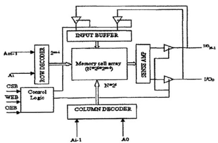 由上圖看出SRAM一般由五大部分組成,即存儲單元陣列、地址譯碼器(包括行譯碼器和列譯碼器)、靈敏放火器、控制電路和緩沖/驅(qū)動電路。在圖中A0-Am-1為地址輸入端,CSB. WEB和OEB為控制端,控制讀寫操作,為低電平有效1100-11ON-1為數(shù)據(jù)輸入輸出端。存儲陣列中的每個存儲單元都與其它單元在行和列上共享電學連接,其中水平方向的連線稱為“字線”,而垂直方向的數(shù)據(jù)流入和流出存儲單元的連線稱為“位線”。