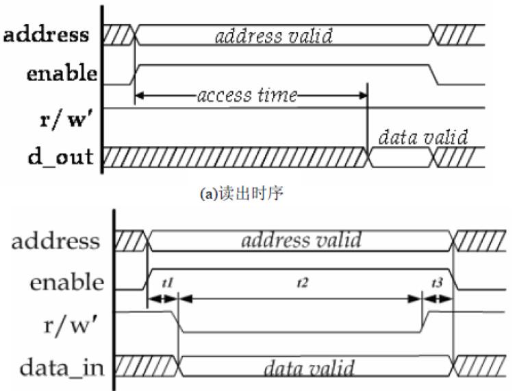 SRAM存儲(chǔ)器的讀寫時(shí)序。在讀出操作中,訪問(wèn)時(shí)間(access time)就是指從地址有效算起,到有效數(shù)據(jù)輸出的時(shí)間;圖1.4 (b)中t1 是從地址和使能信號(hào)穩(wěn)定到寫信號(hào)有效所需的最小時(shí)間,t2 是寫信號(hào)無(wú)效之前必須保持的最小時(shí)間,t3是寫信號(hào)無(wú)效之后地址信號(hào)仍需保持的最小時(shí)間。t1、t2、t3 相加就是一個(gè)寫周期時(shí)間。