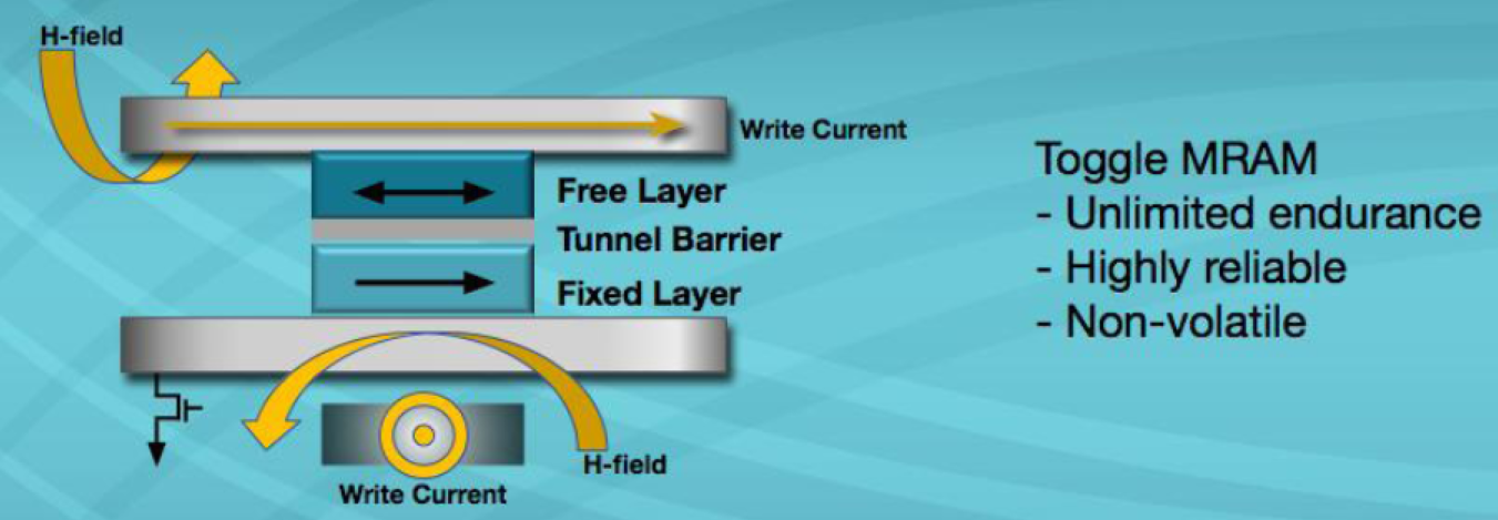 MRAM或磁性隨機(jī)存取存儲(chǔ)器使用具有鐵磁性材料的磁性“狀態(tài)”的1晶體管–1磁性隧道結(jié)(1T-1MTJ)體系結(jié)構(gòu)作為數(shù)據(jù)存儲(chǔ)元素。由于MRAM使用磁性狀態(tài)進(jìn)行存儲(chǔ)(而不是隨時(shí)間推移而“泄漏”的電荷),因此MRAM提供了相當(dāng)長的數(shù)據(jù)保留時(shí)間(+20年)和無限的耐用性。切換磁極化(寫入周期)是在電磁隧道結(jié)(MTJ)上方和下方的導(dǎo)線中產(chǎn)生脈沖電流的結(jié)果(見圖1)。電流脈沖產(chǎn)生的相關(guān)H場(chǎng)改變了鐵磁材料自由層的極化,這種磁開關(guān)不需要原子或電子的位移,這意味著沒有與MRAM相關(guān)的磨損機(jī)制。自由層相對(duì)于固定層的磁矩改變了MTJ的阻抗(見圖2)。阻抗的這種變化表示數(shù)據(jù)的狀態(tài)(“1”或“0”)。通過測(cè)量MTJ的阻抗來實(shí)現(xiàn)傳感(讀取周期)(圖3)。MRAM器件中的讀取周期是非破壞性的,并且相對(duì)較快(35ns)。讀取操作是通過在MTJ兩端施加非常低的電壓來完成的,從而在部件壽命內(nèi)支持無限的操作。