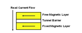 存儲位的置“0”狀態(tài)或置“1”狀態(tài)正是由自由層的極性來確定的。自由層極性和固定層極性一致時(指向相同方向),穿越MTJ棧層的阻抗很低(請參閱圖1)。自由層極性和固定層極性180度相反時(指向相反方向),穿越MTJ棧層的阻抗就很高(請參閱圖2)。由MTJ堆棧中的低阻抗和高阻抗來確定是否將位元讀為“0”或“1”。