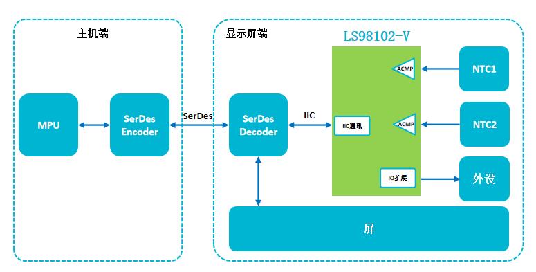 現(xiàn)場可重構(gòu)IC LS98102/-V采用QFN14封裝(車規(guī)級),供電范圍2.3V~5.5V,靜態(tài)電流100nA,12個可任意配置GPIO。該器件具有監(jiān)控2路NTC的溫度,溫度異常時(shí)發(fā)出中斷給SerDes端,主機(jī)控制發(fā)出關(guān)屏等指令信息擴(kuò)展GPIO口,用于控制顯示屏端其他外設(shè)。